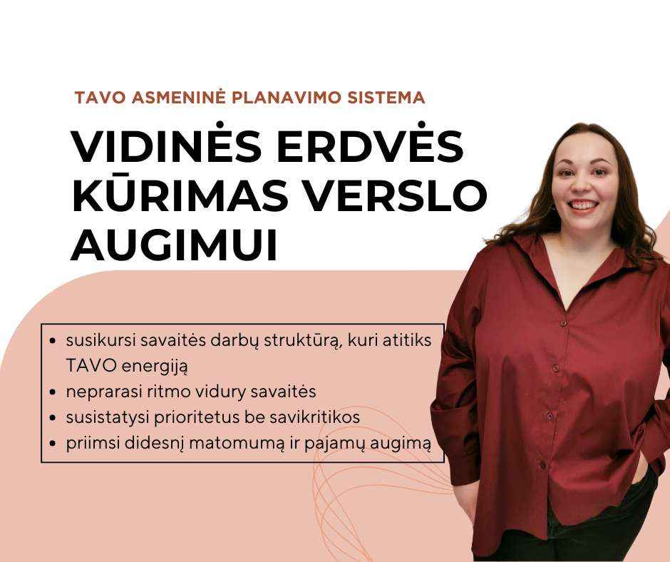 Mano tikslas buvo sukurti tokią sistemą, kuri leistų TAU turėti daugiau vidinės erdvės verslo augimui – matomumui, didesniems pinigams, naujiems klientams bei susikurti stabilią planavimo sistemą, kuri būtų individuali pagal tave ir bet kada prireikus leistų be kaltės jausmo – persiplanuoti darbus.